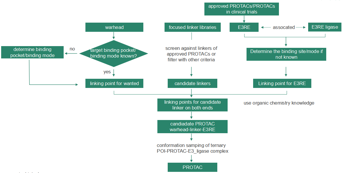 我们通过基于结构的配体设计得到warhead和E3 ligand,然后再通过分析得出target protein与warhead的binding mode,最终确定linker与warhead的可能结合点位和方式。(通常情况下,target protein结构已知,而E3 ligase我们一般会考虑文献中报道过的结构。)