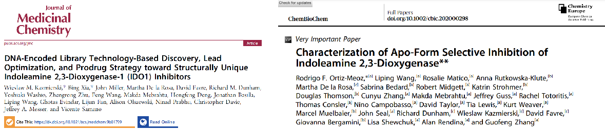 Wes Kazmierski博士:首先,我介绍一下分别发表在JMC和ChemBioChem期刊上的两篇论文:《DNA-Encoded Library Technology-Based Discovery, Lead Optimization, and Prodrug Strategy toward Structurally Unique Indoleamine 2,3-Dioxygenase-1 (IDO1) Inhibitors》和《Characterization of apo-form selective inhibition of indoleamine2,3-dioxygenase》,这两篇是由我和同事撰写的,夏博也为第一篇文章作出了重大贡献。这些论文提供了在本次网络研讨会中未涵盖的额外细节,有兴趣的听众可以进一步查阅。IDO1是一种含血红素的酶,催化色氨酸氧化为N-甲酰基酮尿氨酸,这是酮尿氨酸代谢途径中的第一步及限速步。IDO1与其密切相关的IDO2和TDO共同代谢哺乳动物90%以上的总色氨酸。IDO1在抗病原体感染或细胞炎症时被诱导或上调,这限制了T细胞功能,并导致免疫抑制和局部免疫耐受。IDO1也会帮助癌细胞逃避免疫系统的检测,因此对IDO1的抑制也被认为可以产生抗癌作用。色氨酸的耗竭以及其代谢产物犬尿氨酸的过度生成(此现象可总体表示为高的K/T比)也与中枢神经系统疾病(如阿尔茨海默病)及HIV患者在抗逆转录病毒疗法中增加的发病率和死亡率相关。因此IDO1一直是药物研发中一个热门的靶点,也产生了许多处于临床阶段的IDO1抑制剂。但它们在活性和药代动力学特性上存在不足,需要高剂量和多次服用,对支持患者的用药依从性也不理想。因此我们希望通过高通量筛选(HTS)和DEL筛选发现新化学型的苗头化合物来解决这些问题。