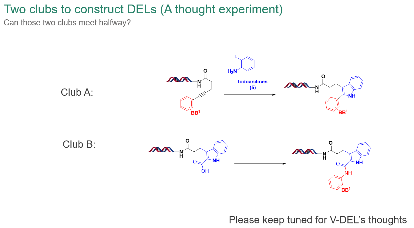 *夏冰博士分享完用Larock杂环化合成DEL 76 DEL 库的细节后,进一步开展介绍了一下当前业界构建DEL库的两大流派(如以下幻灯片所示),a) 在DNA上直接合成杂环,和b) 先合成杂环再对其进行修饰,及它们各自的优缺点,比如前者形成的分子刚性更好,而后者构建的库多样性更高,随后提出了V-DEL建库的新思路和新方案,并承诺将在之后的系列讲座中详细阐述,敬请关注。